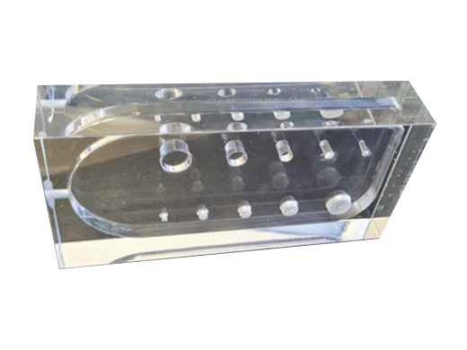 Defect diameters are 15mm, 10mm, 6mm, 4mm and 3mm with decreasing distances separating them – 34mm, 26mm, 25mm and 22mm, center to center.