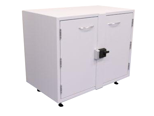 Our standard shielded cupboard is available with 3mm, 6mm or 10mm lead shielding. The outer surface has a durable epoxy stove enamel finish and the inside is finished with a stainless steel liner. The cupboard has two lockable hinged doors and is fitted with one shelf – if required.